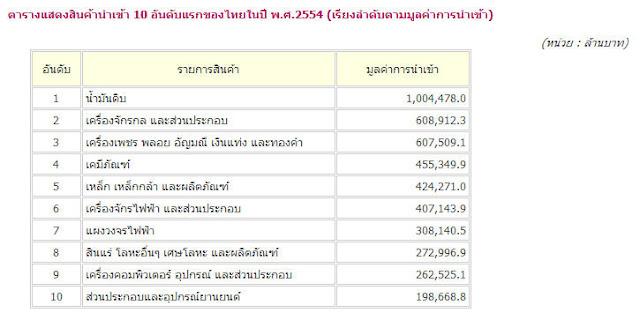 เป็นที่ทราบกันดีอยู่แล้วว่า ในแต่ละปีประเทศไทยต้องนำเข้าน้ำมันจำนวนมหาศาลเพื่อให้เพียงพอต่อความต้อง การของคนทั้งประเทศ ตัวเลขจากกรมส่งเสริมการส่งออก กระทรวงพาณิชย์ เปิดเผยว่า ปี พ.ศ.2554 ที่ผ่านมา "น้ำมันดิบ" คือสินค้านำเข้าที่มีมูลค่าสูงสุดของไทย มีมูลค่าการนำเข้าถึง 1 ล้านล้านบาทต่อปี ดังตารางต่อไปนี้