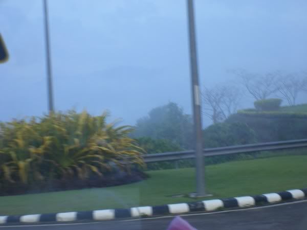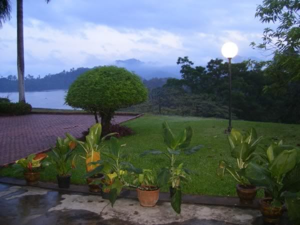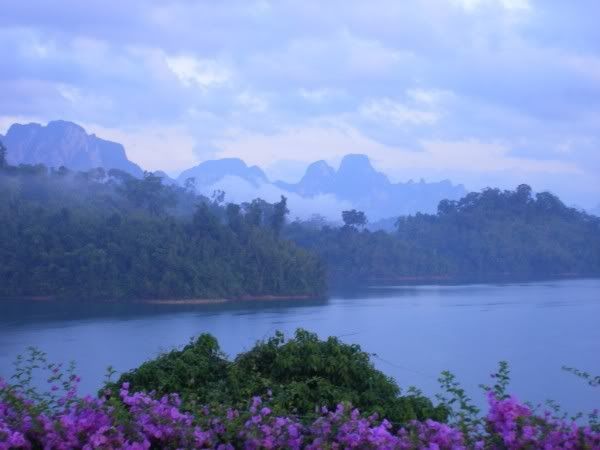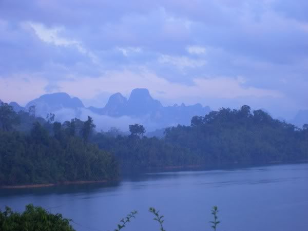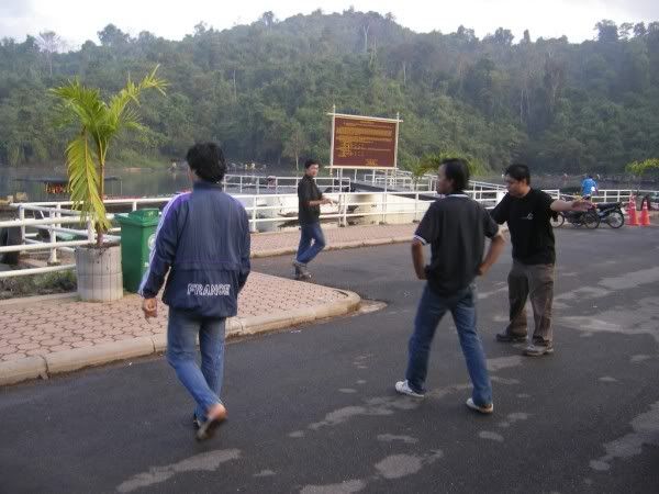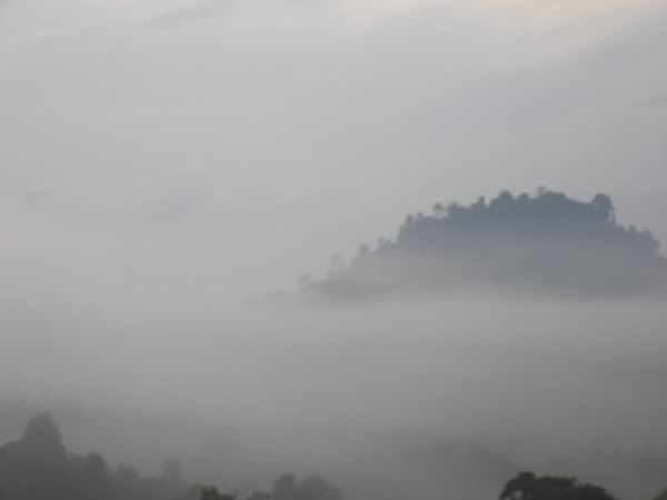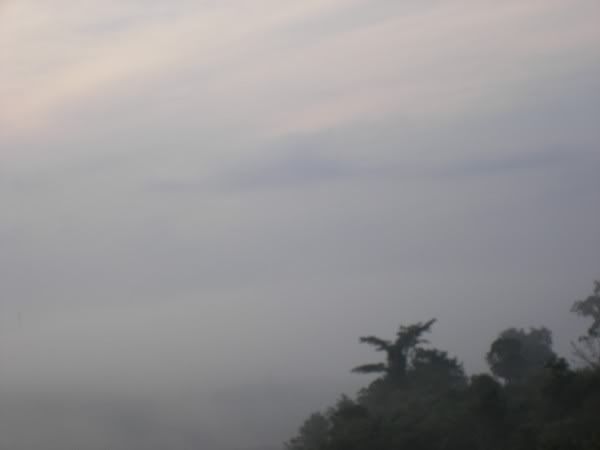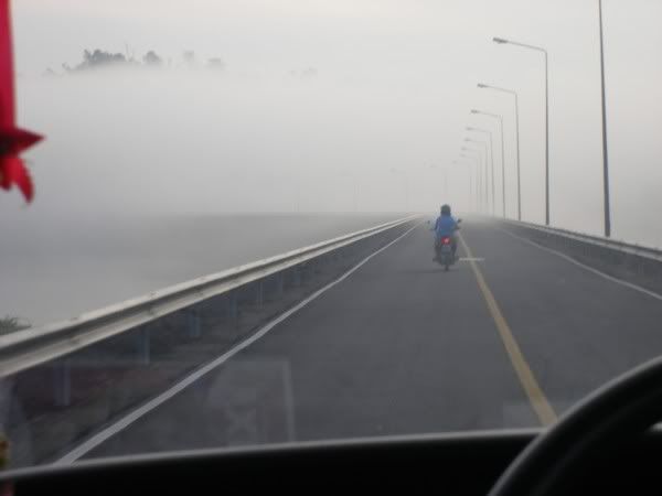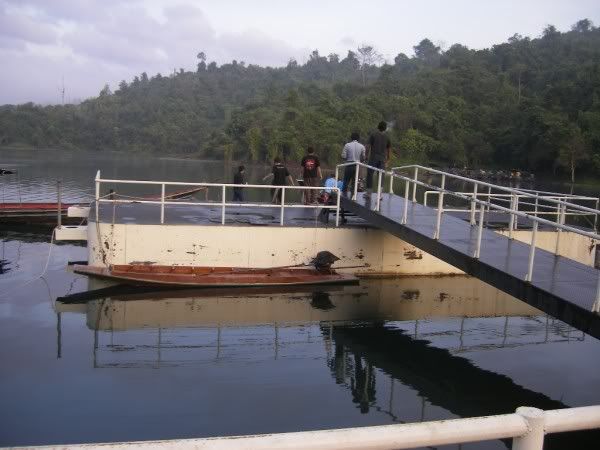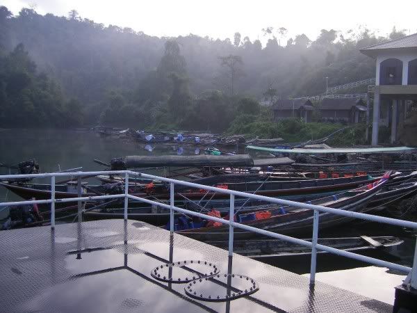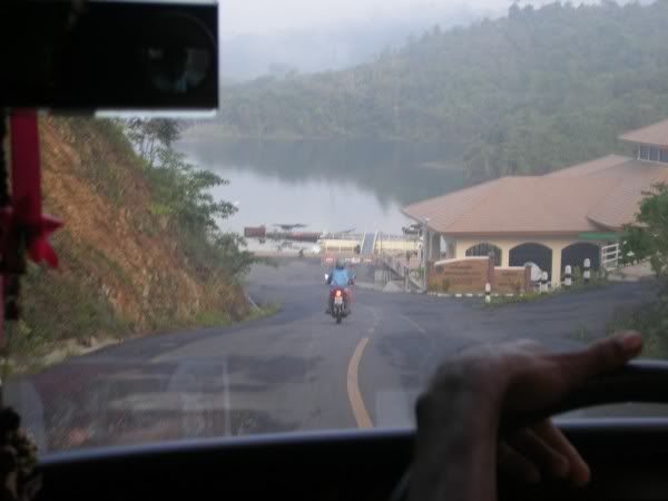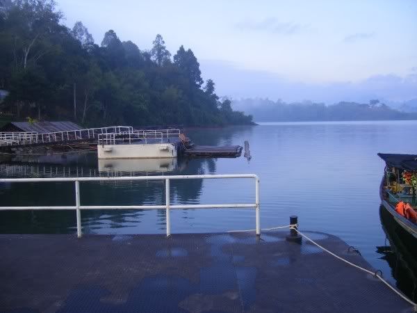 หลังอาหารเช้าเสร็จก็ออกมาขึ้นรถ  ป้าแกมารออยู่แล้ว (นานแล้วด้วยเพราะนัด6โมงมา6โมงครึ่งแถมยังอ้อยอิ่งอีก  )  แล้วแกก็ออกนำทางไปยังท่าน้ำ   มองเห็นสันเขื่อนแล้ว  อยู่ในสายหมอก