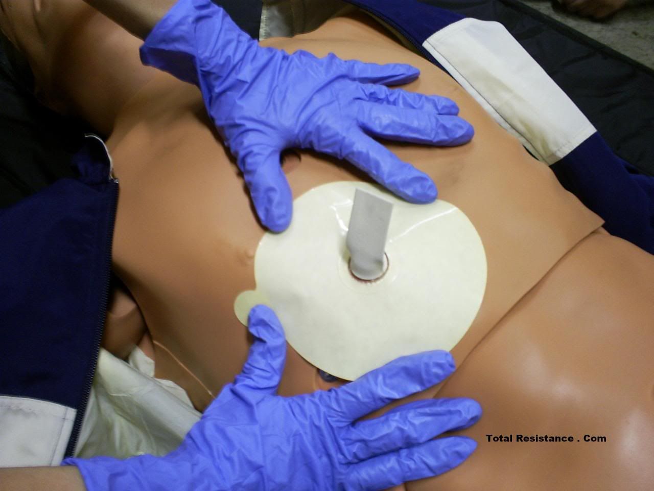 การช่วยปฐมพยาบาลเบื้องต้นเรื่อง sucking chest wound และอาการ collapsed lung ทำให้เกิด tension pneumothorax และต้องช่วยด้วยการแทงแข็มเข้าที่หน้าอกเพื่อปล่อยอากาศที่อัดอยู่ในช่องอก ออก